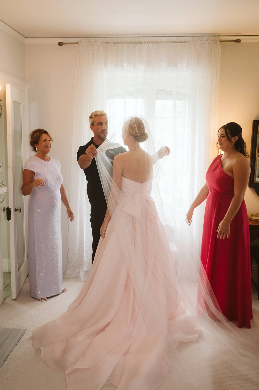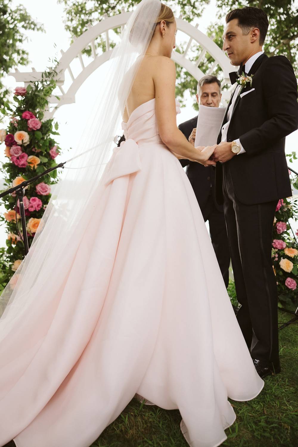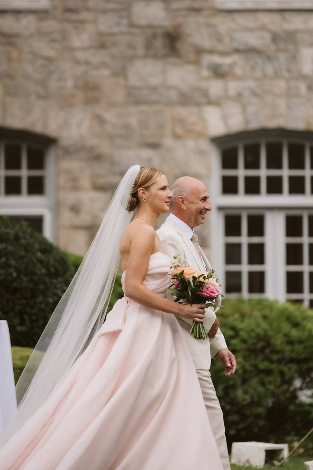The blush hue added a unique and subtle twist to the traditional bridal look, pairing beautifully with the surrounding florals and lakeside setting. A classic bridal veil completed her look, adding a timeless finishing touch for the ceremony and a beautiful view as the bride walked down the aisle with her father.