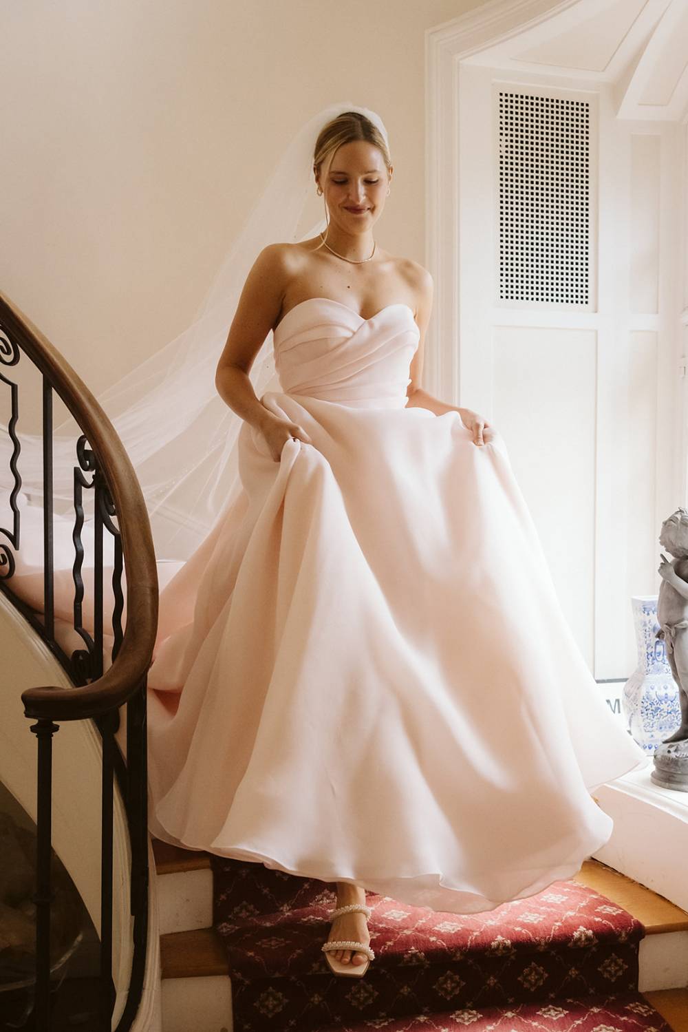 For her wedding day, the bride chose the "Abigail" gown by designer Blue Willow in the specialty blush hue. This romantic bridal ball gown made a statement while still feeling soft and elegant with it's delicate light pink shade. The strapless silhouette highlighted the bodice beautifully, while the full skirt flowed effortlessly as she moved throughout the wedding.