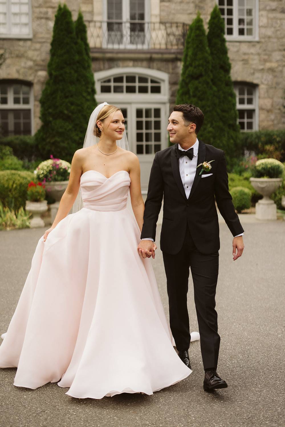 All brides considering a chic lakeside wedding venue, don’t miss this inspiration with a stunning blush bridal ball gown from one of our recent The White Dress by The Shore brides. Set against the serene backdrop of Long Island Sound, this elegant wedding at Wainwright House was filled with soft blush tones, classic black tie style, and heartfelt moments shared with family and friends. And, we are so honored to share all the beautiful details with you!
