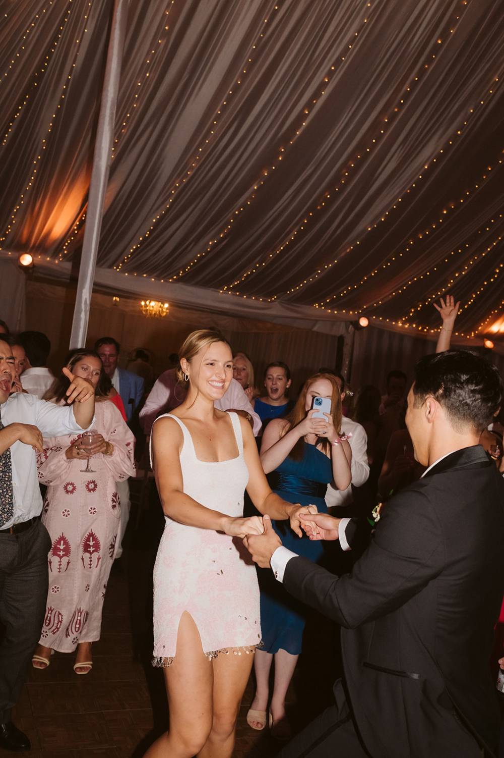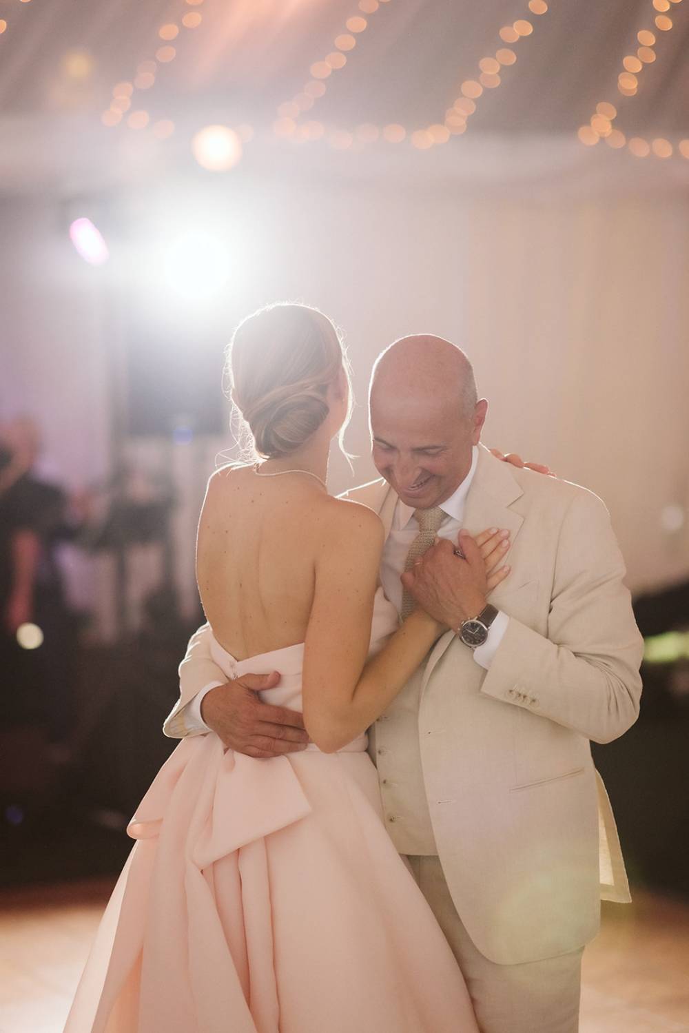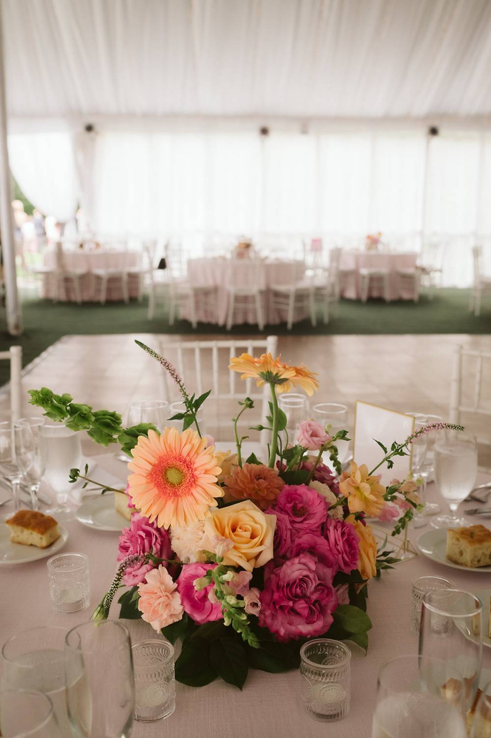 Following the wedding ceremony, guests gathered for a classic cocktail hour among the manicured lawn of the lakeside wedding venue. As guests entered the tent for the reception they were greeted with bright floral blooms on all tables. The bride enjoyed her first dance with her new husband and a wonderful dance with her father and her dress perfectly swayed across the dance floor.