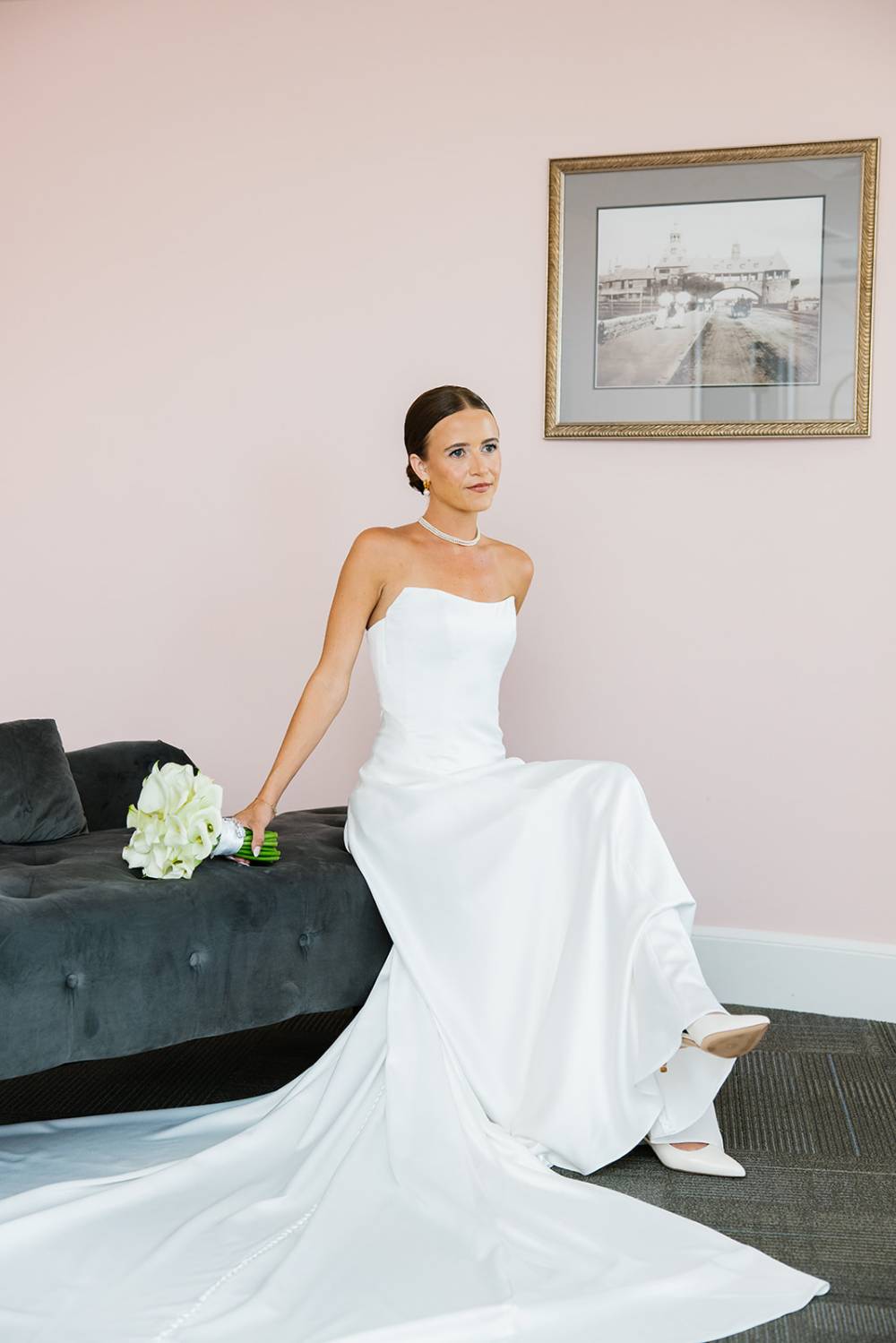 For her elegant coastal Rhode Island wedding, our TWD bride Sarah chose the Addilyn wedding gown by Jenny Yoo. This strapless wedding dress features a drop waist silhouette, giving off an old Hollywood vibe. The sleek silhouette and silky satin material lends itself to a minimalist design that allows the bride to shine. The skirt flows into a chapel length train that Sarah later bustled for the dance floor and reception. She paired the strapless wedding dress with a pearl necklace and earrings for a classic look. For the wedding ceremony Sarah paired a simple chapel length bridal veil to add to the elegance of her Jenny Yoo bridal gown.