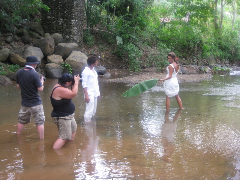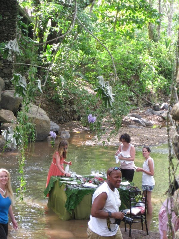 The second day we shot in the rain forest. Candice, Tony and Carla scouted an amazing location! Tony and Candice worked their magic and created a stunning table scape in the river under a bridge. The setting was completely unique and breathtaking.