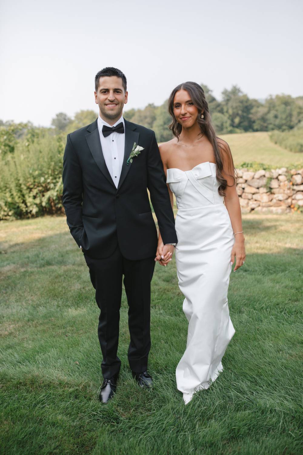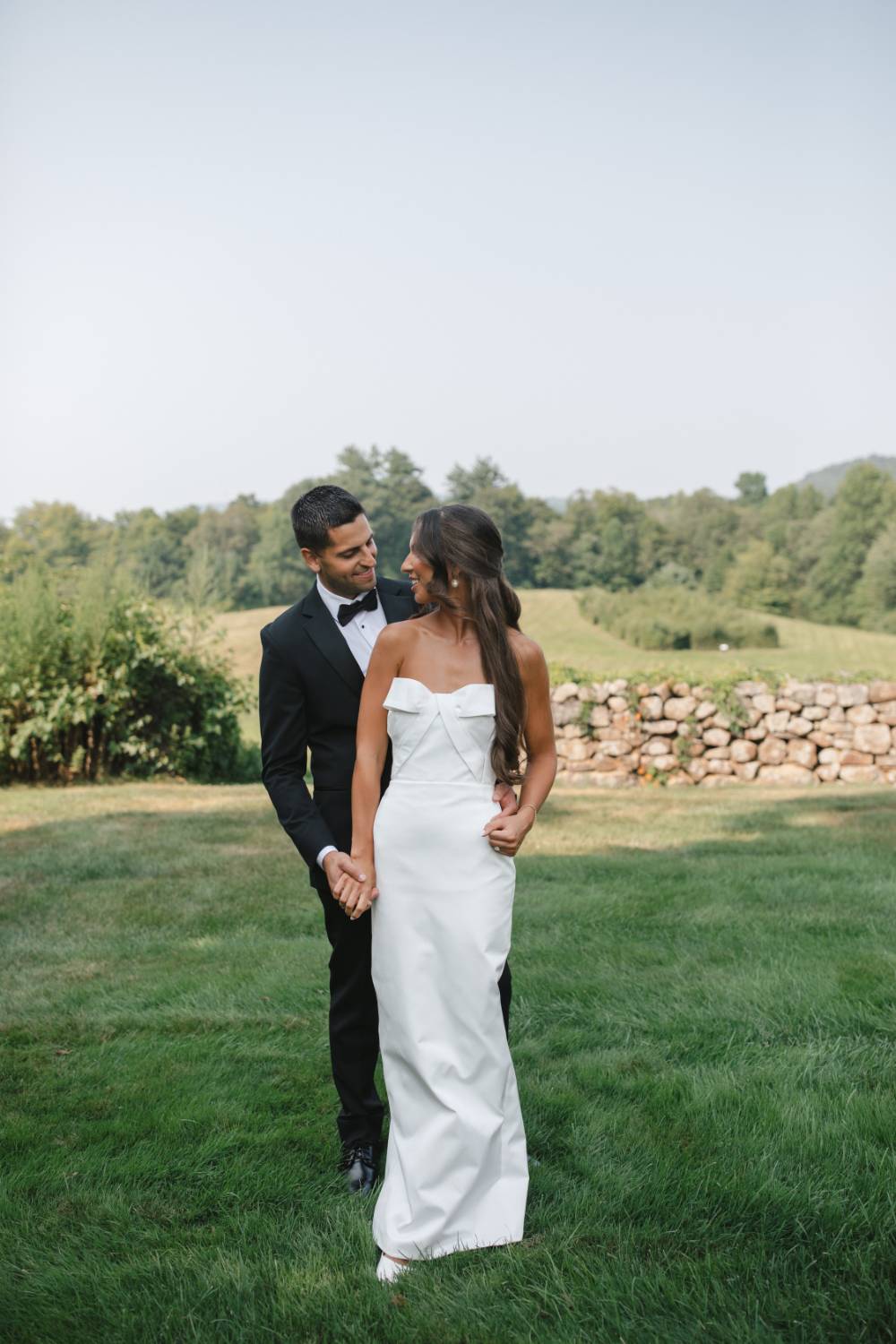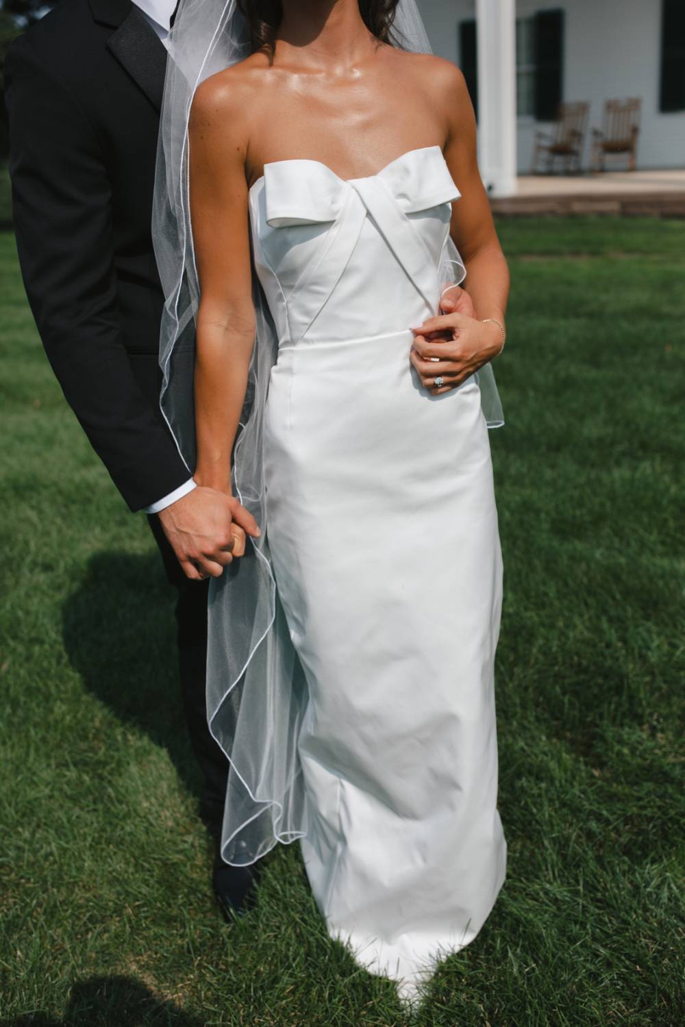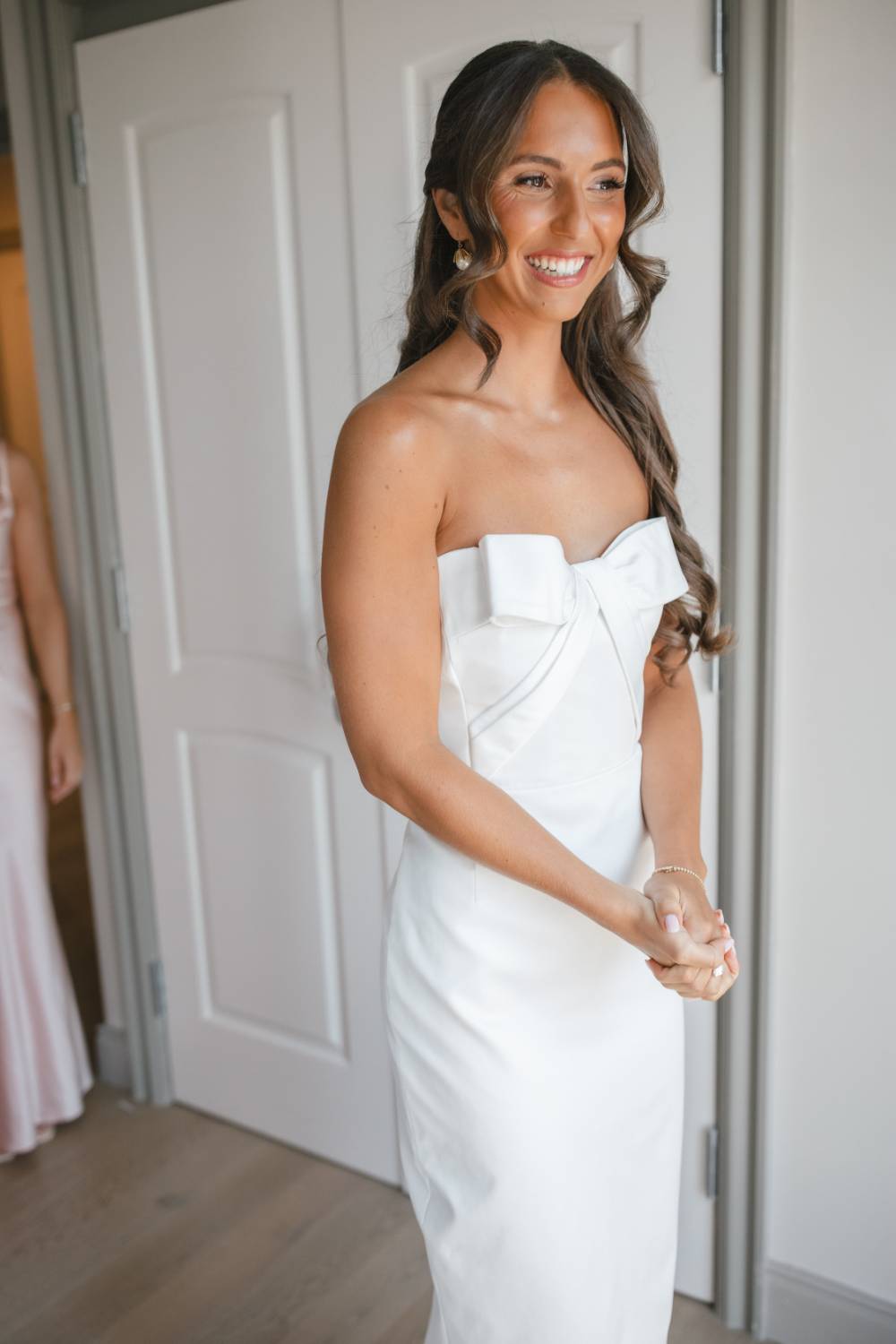 With its clean lines and tailored silhouette, Olivia’s wedding gown was a customized version of bridal designer Antonio Gual's ‘Chappy’ style wedding gown. The structured strapless bodice of her custom wedding dress featured a soft bow detail and a sleek, elongated silhouette for a timeless bridal look. Her wedding dress paired with a sheer bridal veil and understated bridal accessories felt both modern and classic, perfect for their Newport wedding.