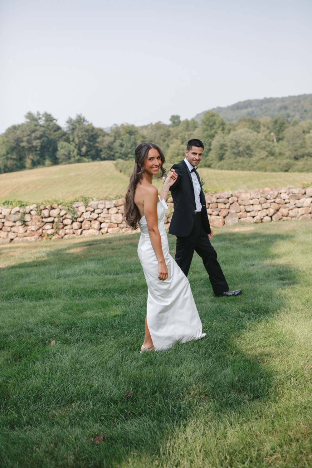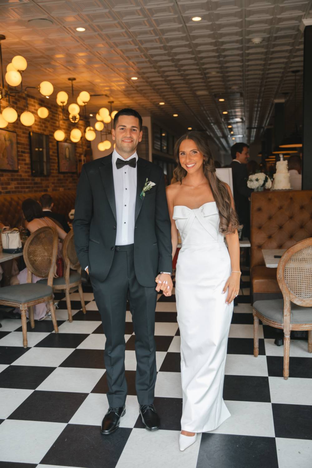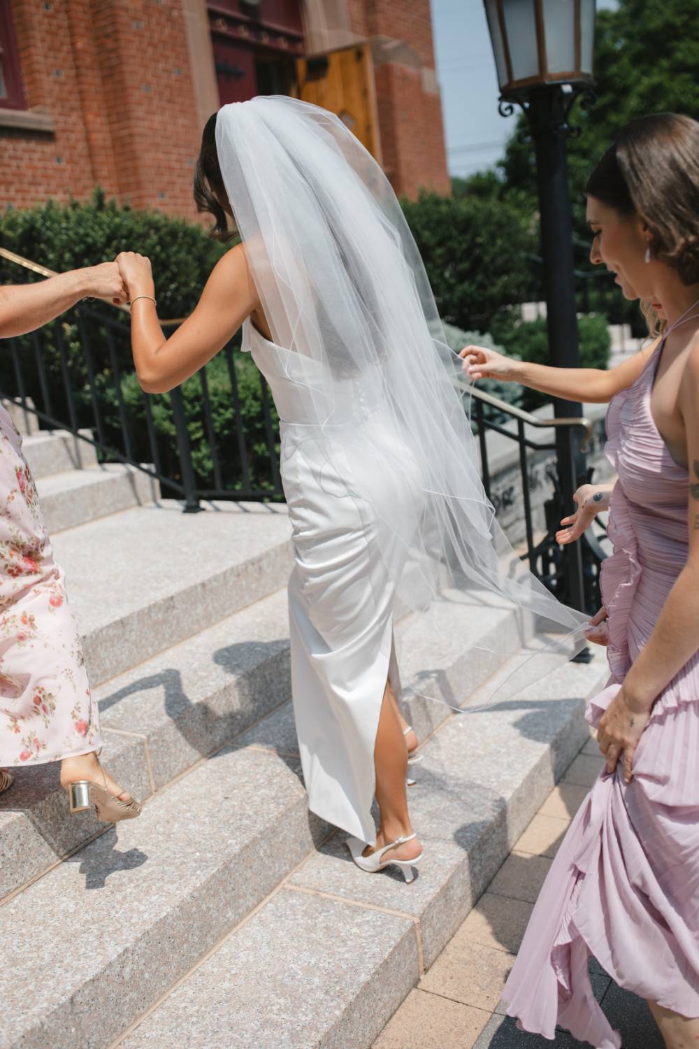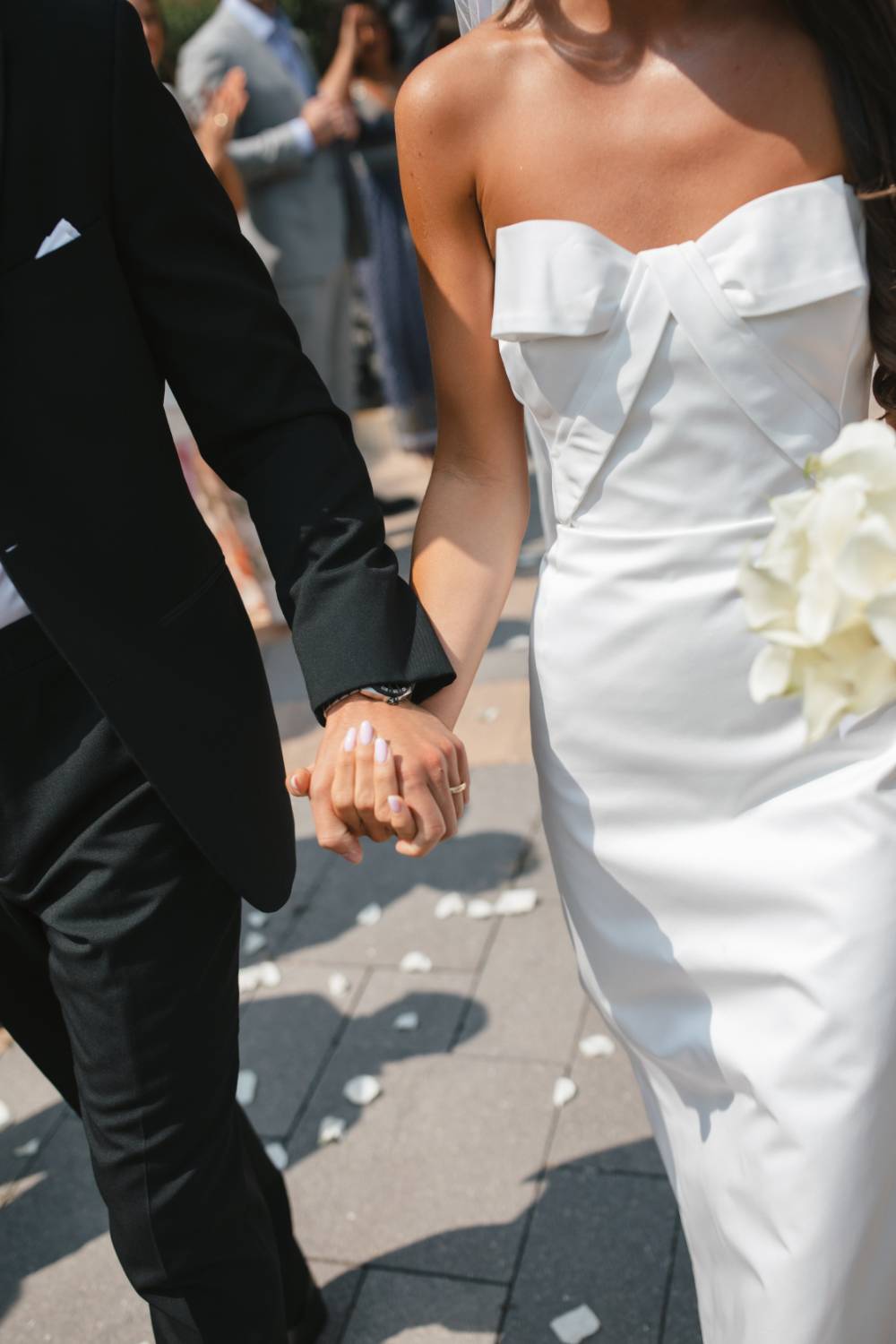 With its clean lines and tailored silhouette, Olivia’s wedding gown was a customized version of bridal designer Antonio Gual's ‘Chappy’ style wedding gown. The structured strapless bodice of her custom wedding dress featured a soft bow detail and a sleek, elongated silhouette for a timeless bridal look. Her wedding dress paired with a sheer bridal veil and understated bridal accessories felt both modern and classic, perfect for their Newport wedding.
