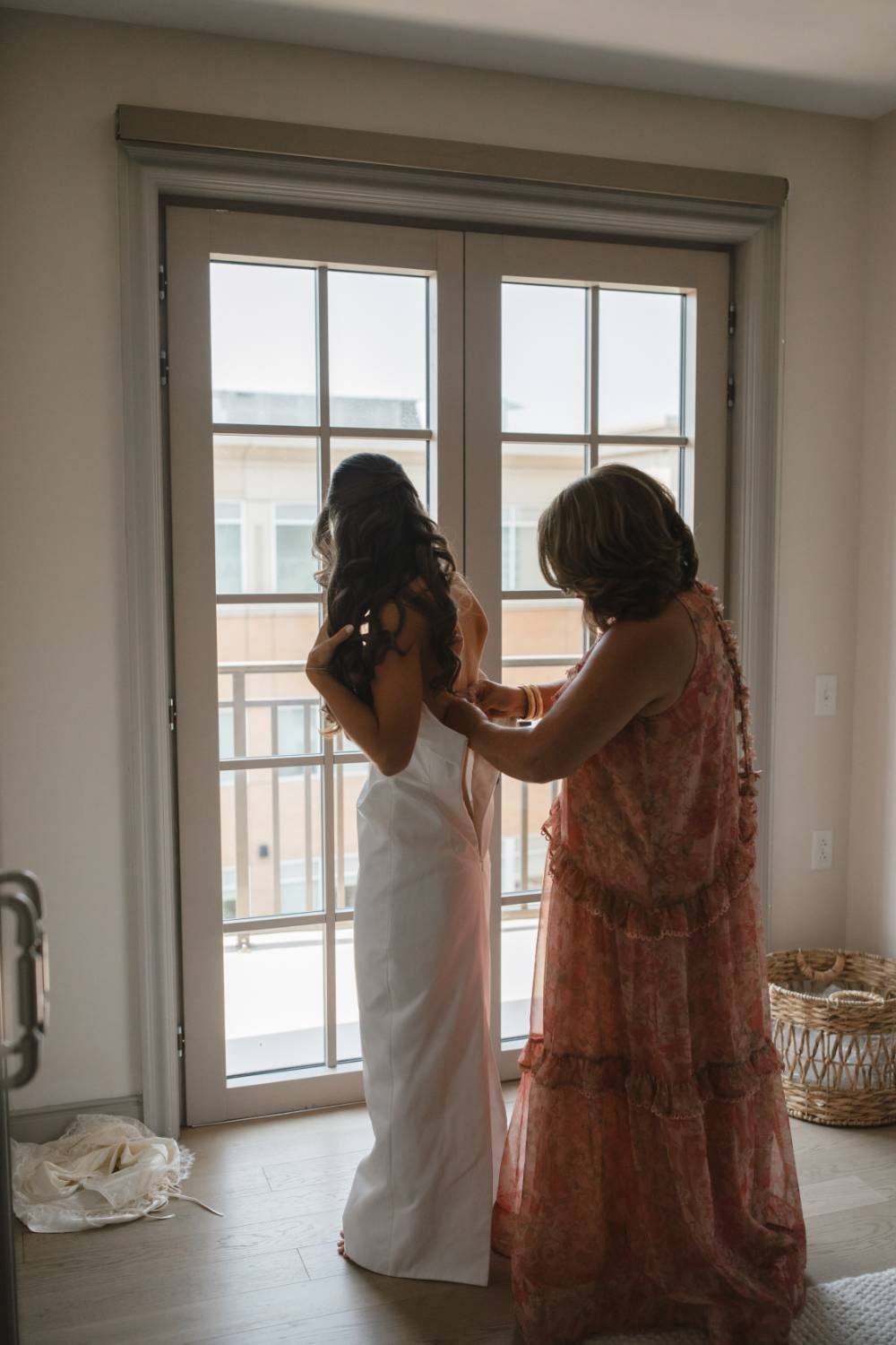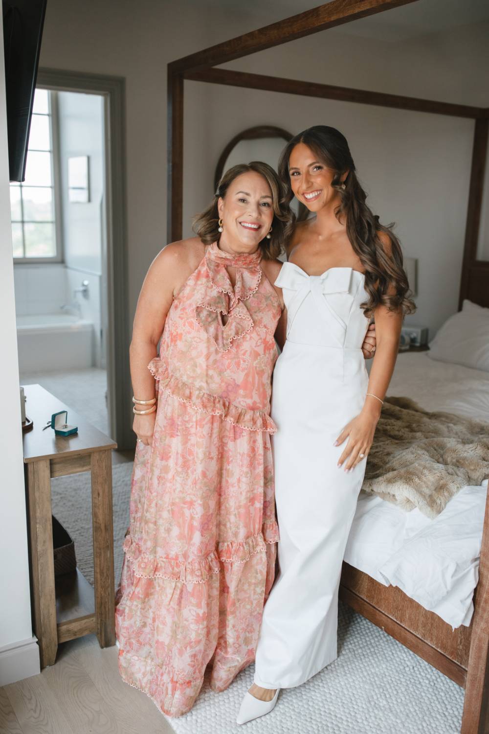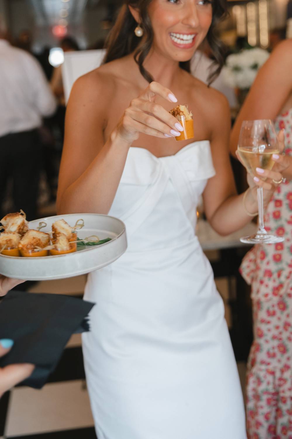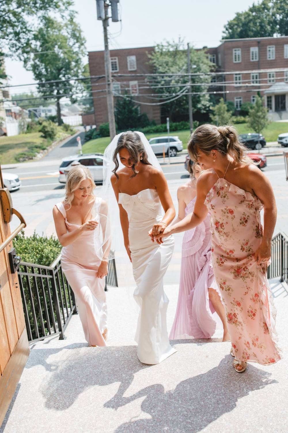 With its clean lines and tailored silhouette, Olivia’s wedding gown was a customized version of bridal designer Antonio Gual's ‘Chappy’ style wedding gown. The structured strapless bodice of her custom wedding dress featured a soft bow detail and a sleek, elongated silhouette for a timeless bridal look. Her wedding dress paired with a sheer bridal veil and understated bridal accessories felt both modern and classic, perfect for their Newport wedding.