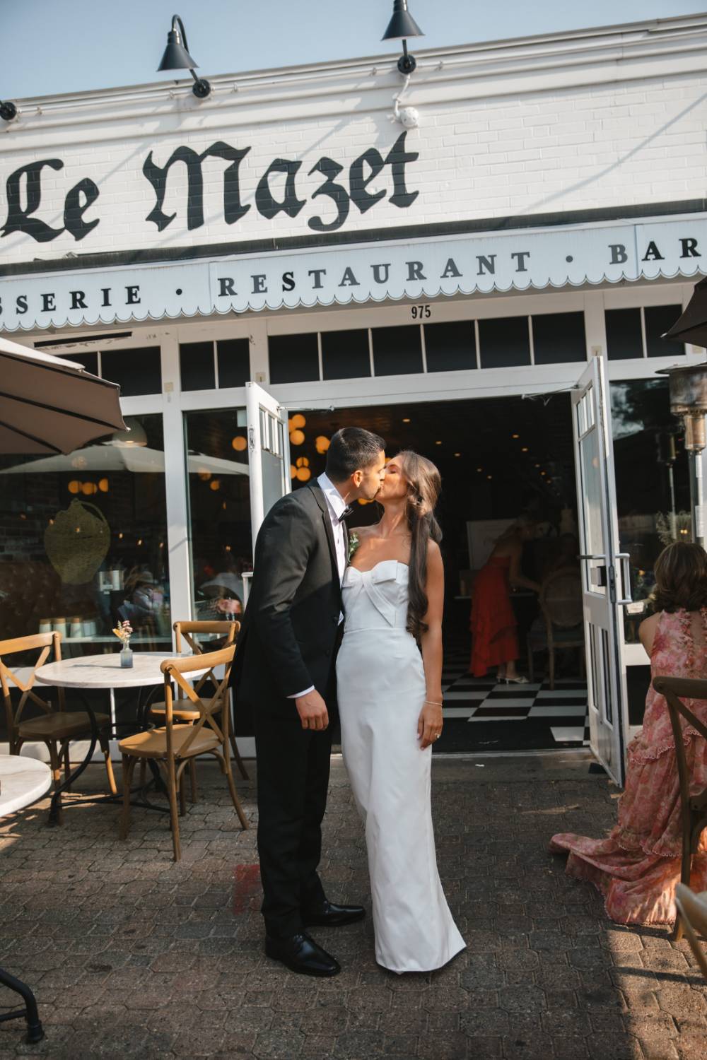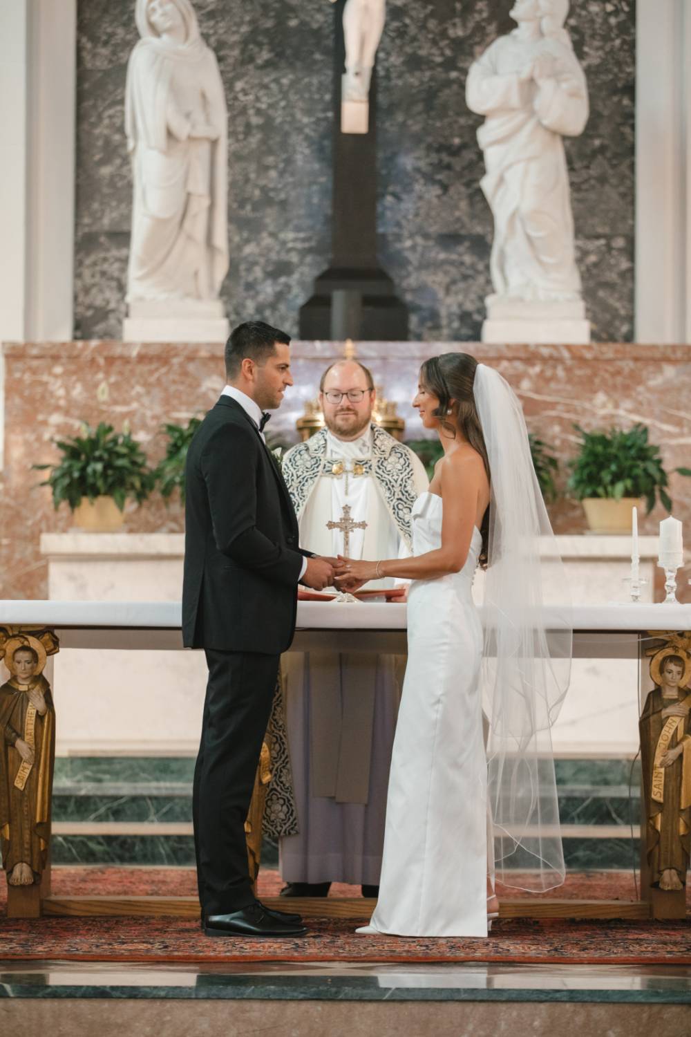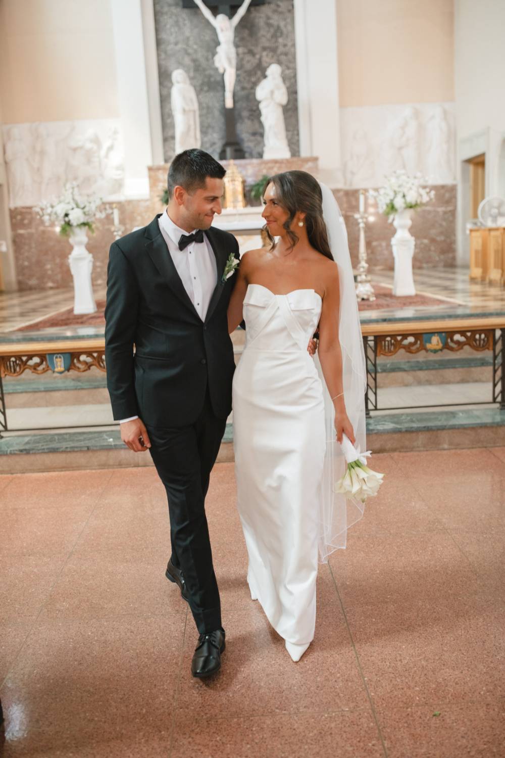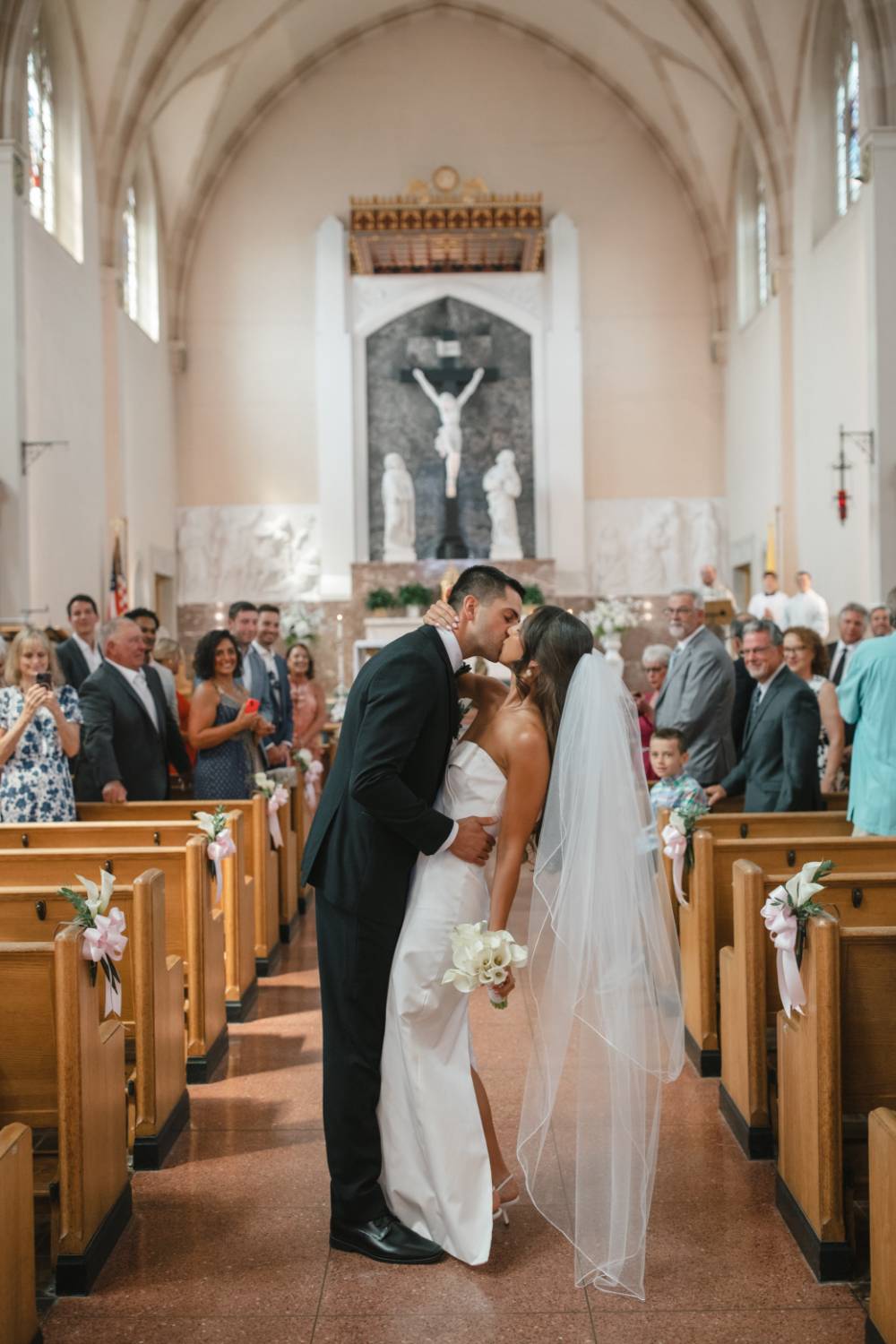 Olivia and Michael’s wedding day took place in Rhode Island at a timeless church for the ceremony and a chic restaurant for the dinner reception. Following the wedding ceremony, Olivia and Michael stepped outside for portraits that captured the relaxed beauty of the coastal Rhode Island settings. Every setting for their special day complemented Olivia’s refined bridal look and Michael’s classic black tuxedo.