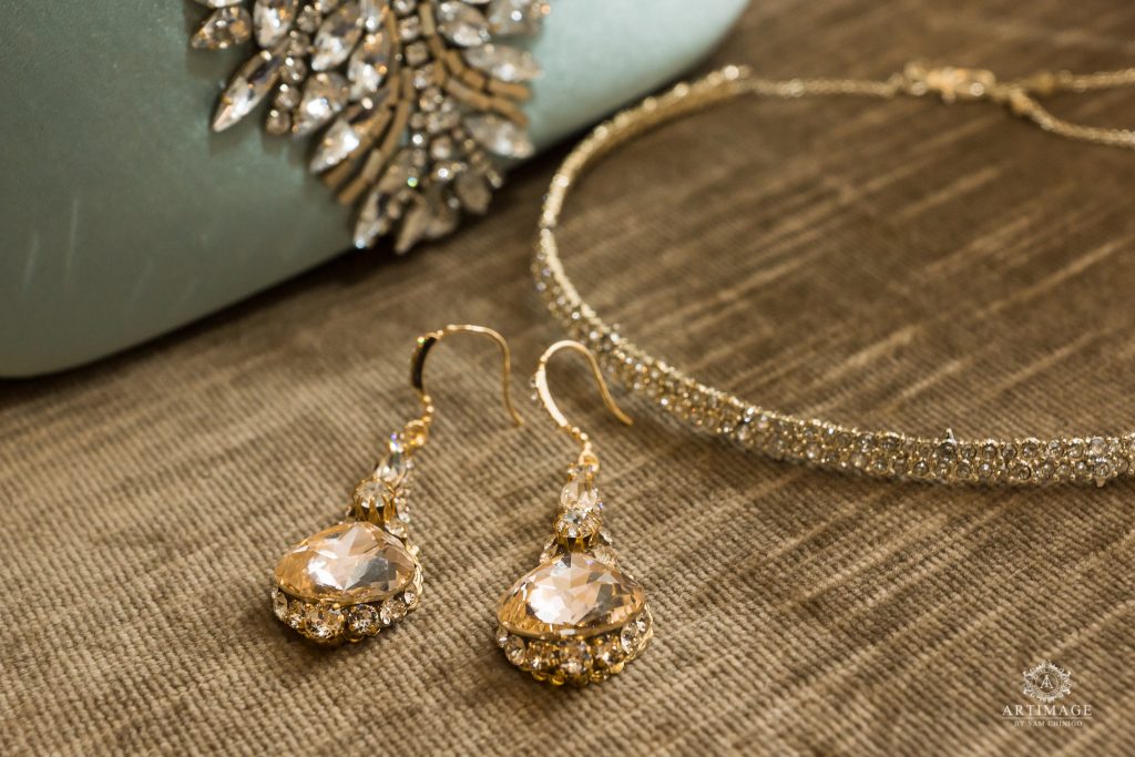 Melissa wanted a veil to accent the unique color of her gown, so our in-house seamstress made her a custom veil in the same color tulle. Melissa's Haute Bride earrings were the perfect shade of gold to accentuate the warmth of her gown.