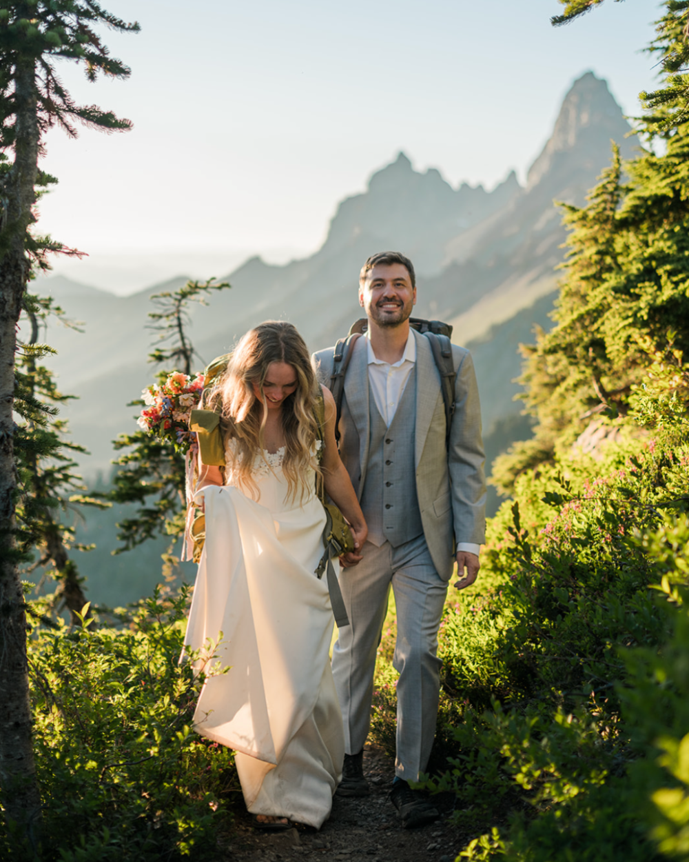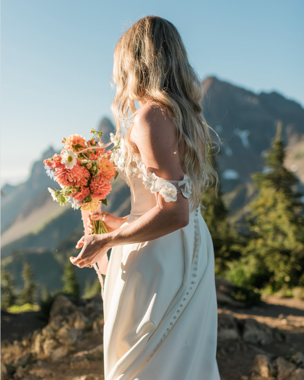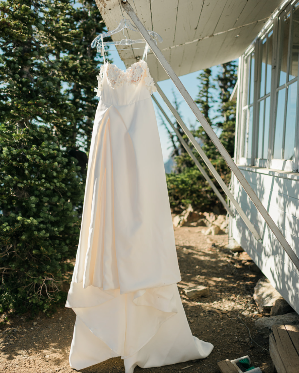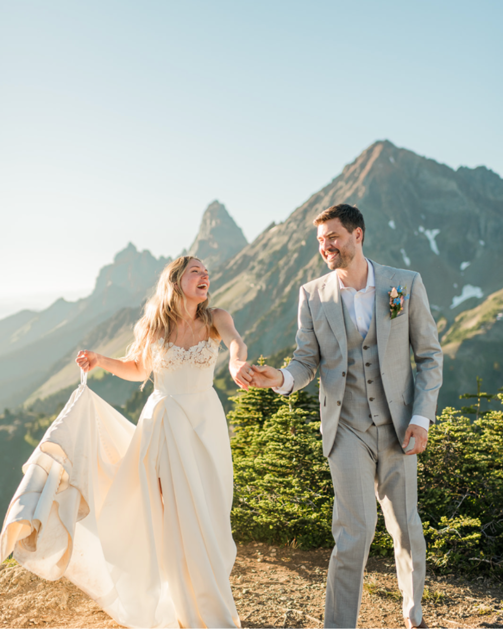 And "yes," this adventurous bride hiked in her wedding gown. Hidden pockets and a flowing slit added comfort and movement, making it the perfect choice for a day filled with love, laughter, and high-altitude romance.
