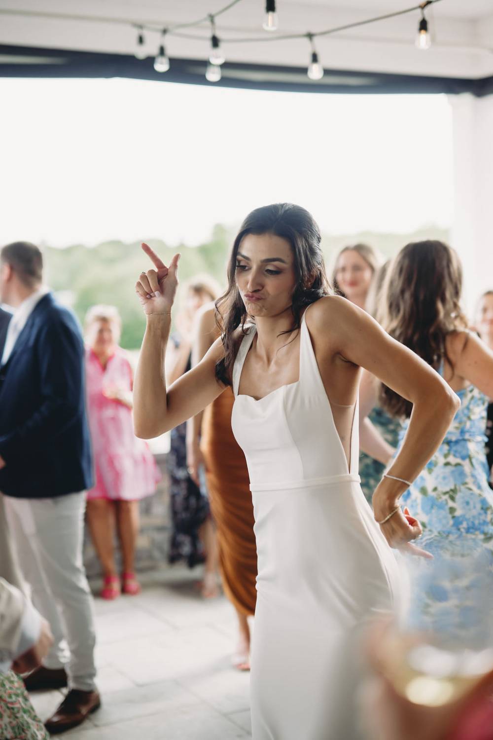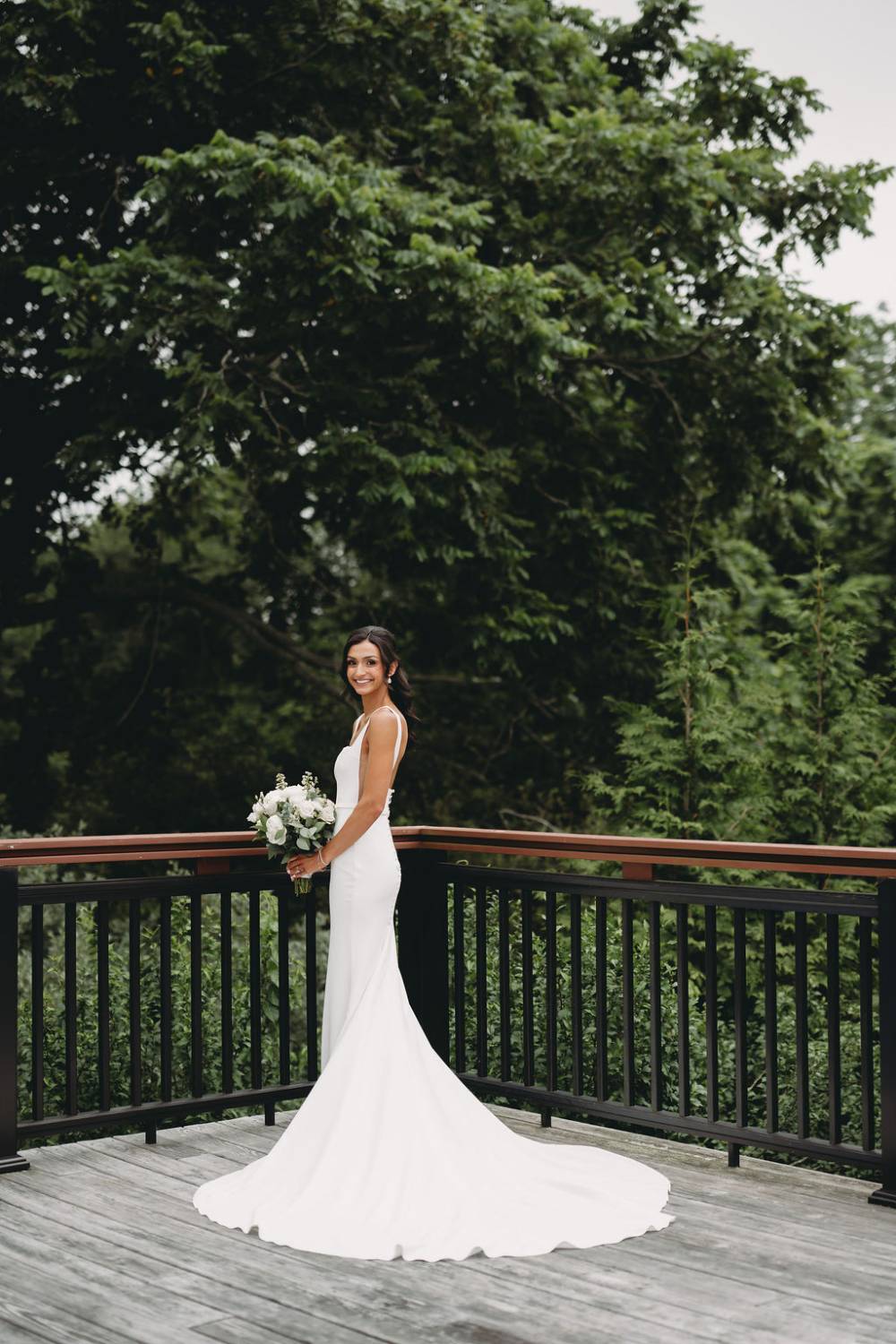 The fitted design of her dress skims the body beautifully before flowing into a soft, understated train. The train showed beautifully in wedding photos while Caroline moved throughout bridal portraits along the venue’s gardens and greens as well as dancing to the DJ all evening.