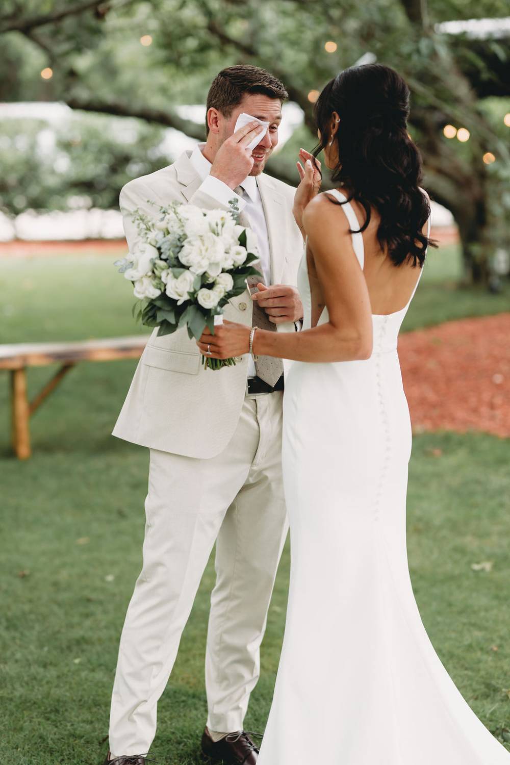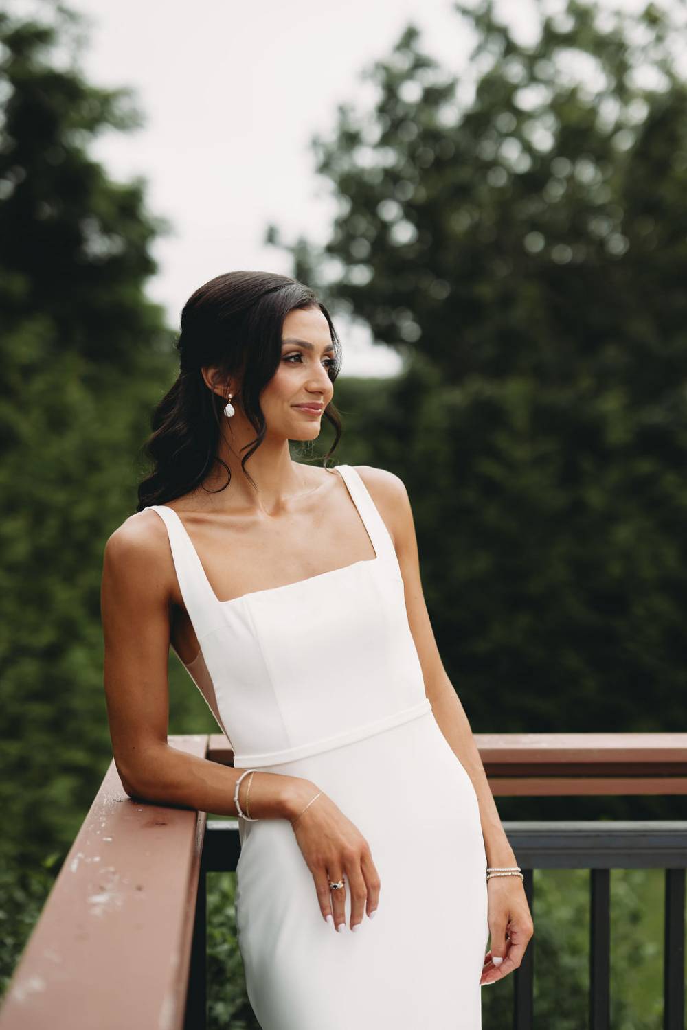 For her big day, Caroline chose the Hunter Gown by Made With Love. This stunning minimalist wedding dress embodied modern bridal elegance for her walk down the aisle. This sleek silhouette featured a square neckline and clean tailored lines. The delicate straps highlighted the neckline and created a timeless feel for this sophisticated wedding dress.